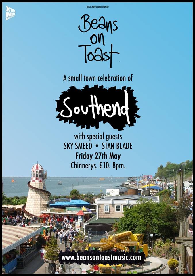Sports | Educational | Music | Theatre | Children | Art | Charity | Business | Misc « All Events This event has passed. Beans on Toast, Sky Smeed & Stan Blade @ Chinnerys May 27 @ 8:00 pm - 11:00 pm | £10 Event Navigation « Jack Pack: 2016 UK Tour Mission ImPUDSEYble Tour 2016 » A small town celebration of Southend! Join Beans on Toast at Chinnerys on Southend seafront, with special guests Sky Smeed and Stan Blade, for some urban folk music, celebrating our small town of Southend! + Google Calendar+ iCal Export Details Date: May 27 Time: 8:00 pm - 11:00 pm Cost: £10 Event Category: Music Event Tags:Southend Nightlife Website: http://beansontoastmusic.com/live-shows/ Organizer Chinnerys Phone: 01702 467305 Website: www.chinnerys.co.uk Venue Chinnerys 21-22 Marine Parade, Southend-on-Sea, Essex SS1 2EJ United Kingdom + Google Map Phone: 01702 467305 Website: www.chinnerys.co.uk If you have an event you would like to see featured on the Events Calendar, please contact us with the event details and we will get back to you shortly.
