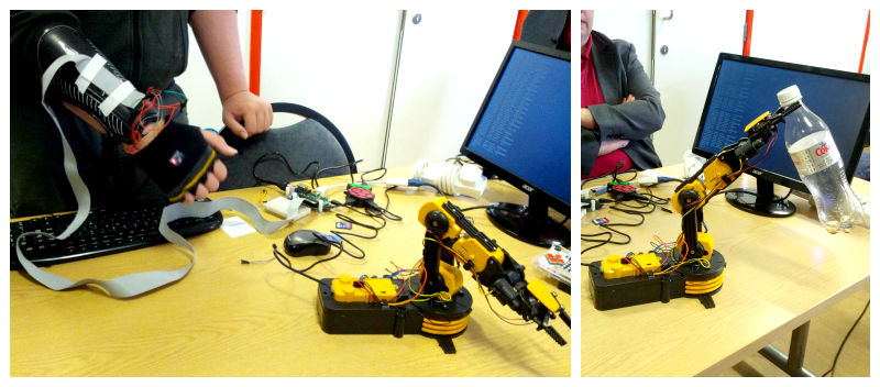 Southend Raspberry Jam (August 2014) Ria August 22, 2014 Local News, Southend 9 Comments Yet another fantastic day at the Southend Raspberry Jam on Saturday 16th August 2014. This time the event was held at the Tickfield Centre, rather than at TAP where it has been held for the previous Southend Raspberry Jams back in March and June, as well as the Open Electronics Day back in May. The extra space at the Tickfield Centre was definitely needed as the turnout for this Southend Raspberry Jam was enormous! I only had to walk to the Jam, but MyPiFi guy traveled over a hundred miles to get there! Now that the event’s getting bigger, there are so many talks and workshops throughout the day that it’s a bit of a mind-boggle where to start. There were two separate conference rooms where talks were happening simultaneously, so unfortunately I was unable to sit down for each one, but I managed to make it to a couple interesting talks amongst all the workshop and table browsing in the main room. LEDs. LEDs everywhere. The first thing you’ll probably notice is the sheer amount of LEDs everywhere. It’s hard to compete with brightly coloured flashing lights, so it seemed that workshop tables with LED displays were never lonely for company. (I suggested to Richard at the Cable Table that perhaps next time, when it’s getting closer to Christmas, he could incorporate LEDs into his Cat5 cabling workshop for geeky fairy light Christmas decorations.) Peter Onion, pictured above with his fantastic beard, had brought along four 32×32 RGB LED panels. Its mesmerising colours and patterns that twisted and contorted like some kind of trippy kaleidoscope light show. He also demonstrated a game of LED Tetris and LED Game of Life! David Whale had an LED Neopixel strip that he could control the colour patterns of using three touch-sensitive resistive strips: Red, Green and Blue. By sliding your finger up and down each of the strips, you can change, combine and overlap the colours and affect the brightness of the colours displayed on the LED strip. David said that he intends to add a display to this which will show the hex code of the colour displayed on the strip (such as #FF0000 for red), so you could effectively mix a colour together and see what the hex code is for that colour. A young girl was trying to mix a fluorescent neon pink colour to match her backpack! I love how fun and interactive this colour mixer was. David Whale was also at the Southend Raspberry Jam promoting the STEM Ambassador scheme and ExploreSTEM. STEM (Science, Technology, Engineering, Mathematics) Ambassadors use their own enthusiasm in their STEM subject to inspire young people to get involved and enjoy STEM subjects. Raspberry Pi Powered Robot Arm! 15 year old Joseph Thomas demonstrated his robot arm with pincers that can pick things up and move them around. The robot arm is controlled by a nifty wearable gadget he designed himself with fingerless gloves and an arm guard! Using an accelerometer, he can move the robot arm as he moves his own arm and, with little buttons inside the palm of his glove, he can control the pincers’ grip to open and close. It was fantastic and I can certainly see the many uses for this kind of thing in the near future. Though I did feel sorry for Joseph having to wear that thing all day; far too hot for gloves in this weather! There was a very proud father sat beside him for the workshop though :) Quadcopters with Dave Black There was a very interesting presentation by Dave Black - local legend, aerial videographer and Raspberry Pi enthusiast. Though I had seen his beautiful aerial videos of Southend and Essex before, trending locally on Twitter and Facebook, I’ve discovered a whole new appreciation for what it is that he does. Southend From Above: Aerial Videos by Dave Black Dave Black showed us his very impressive octocopter and quadcopter, which he uses to capture amazing shots of locations from perspectives that usually only the birds in the sky are lucky enough to see. He shared with the audience a few of his videos, the sort of work he has been able to achieve with his equipment, and how he records his videos. He also explained the legalities of what he does, and how his flights are regulated. It’s unbelievable the amount of detail and planning that goes into every video he creates. He has to be the director, the cameraman, the pilot, the safety officer and more! Logging all his flights, and communicating with Southend Airport when he has to, as well as maintaining certain heights and distances to comply with the CAA (Civil Aviation Authority). Using Your Brainwaves to Control Radios Ji Hu held a talk about her incredible Mindio experiment. Basically, she presented to us this stylish piece of headgear that picks up brainwave signals of whomever is wearing it and can detect three basic states of mind: Meditation (or calmness), Normal, Concentration (or intense focus). Depending on the wearer’s mental state, their brainwaves can control three different radios that represent the three different states of mind. In doing so, Ji Hu was demonstrating the possibilities of using the mind as another electronic input, although the output possibilities are still somewhat limited. The most interesting thing about her Mindio experiment though was the sort of results she has seen from it. How she has seen that females have actually been able to control their state of mind faster or easier than males, and that they could relax to reach a mental state of calmness quicker than males could. Extremely interesting to see how this bit of headgear hooked up to three radios can demonstrate the mental effects of the environment around you, by allowing you to physically see (or hear!) how you react to certain stressful situations. Unfortunately with the amount of interest this experiment generated, I wasn’t quick enough to her workshop table after the talk to try the device on myself. On a related note, regarding t